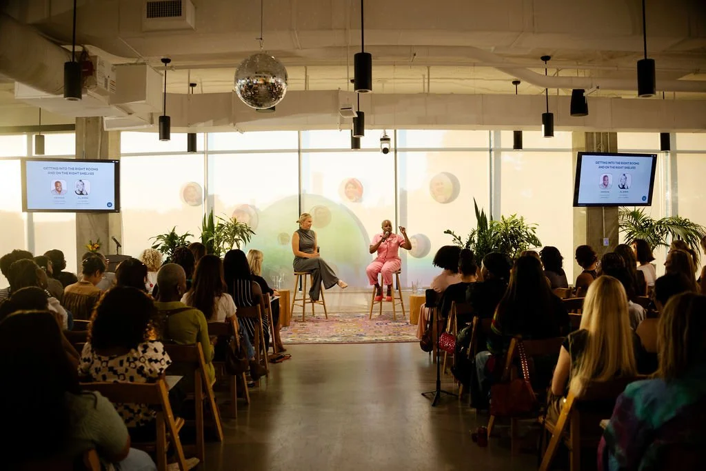 Kim Roxie and Jill Peterson kicked off the night with bold honesty and contagious energy. Kim challenged us to ask ourselves, “Who told you that you couldn’t?” and urged every founder to have the audacity to believe that she can. She shared how she started small, hosting trunk shows to learn where her products belonged, and how she negotiated for pilot programs and regional placements before going national with her LAMIK Beauty products. Jill reminded us that pitching isn’t about begging for approval, it’s about proving value: “We’re going to make you more money if you bring us in.”